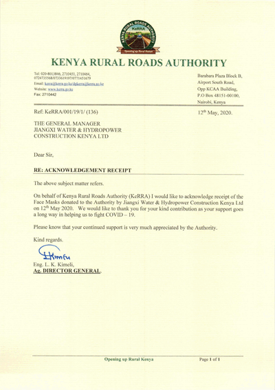 收到來自江西水建捐贈的防疫物資后,肯尼亞鄉村公路局局長由衷地表示感激,并向肯尼亞分公司寫了一封感謝信,他在信中表示:“江西水建友好慷慨的捐贈,將為我們對抗新冠肺炎疫情提供長遠的支持,肯尼亞鄉村公路局對此深表感激?!?